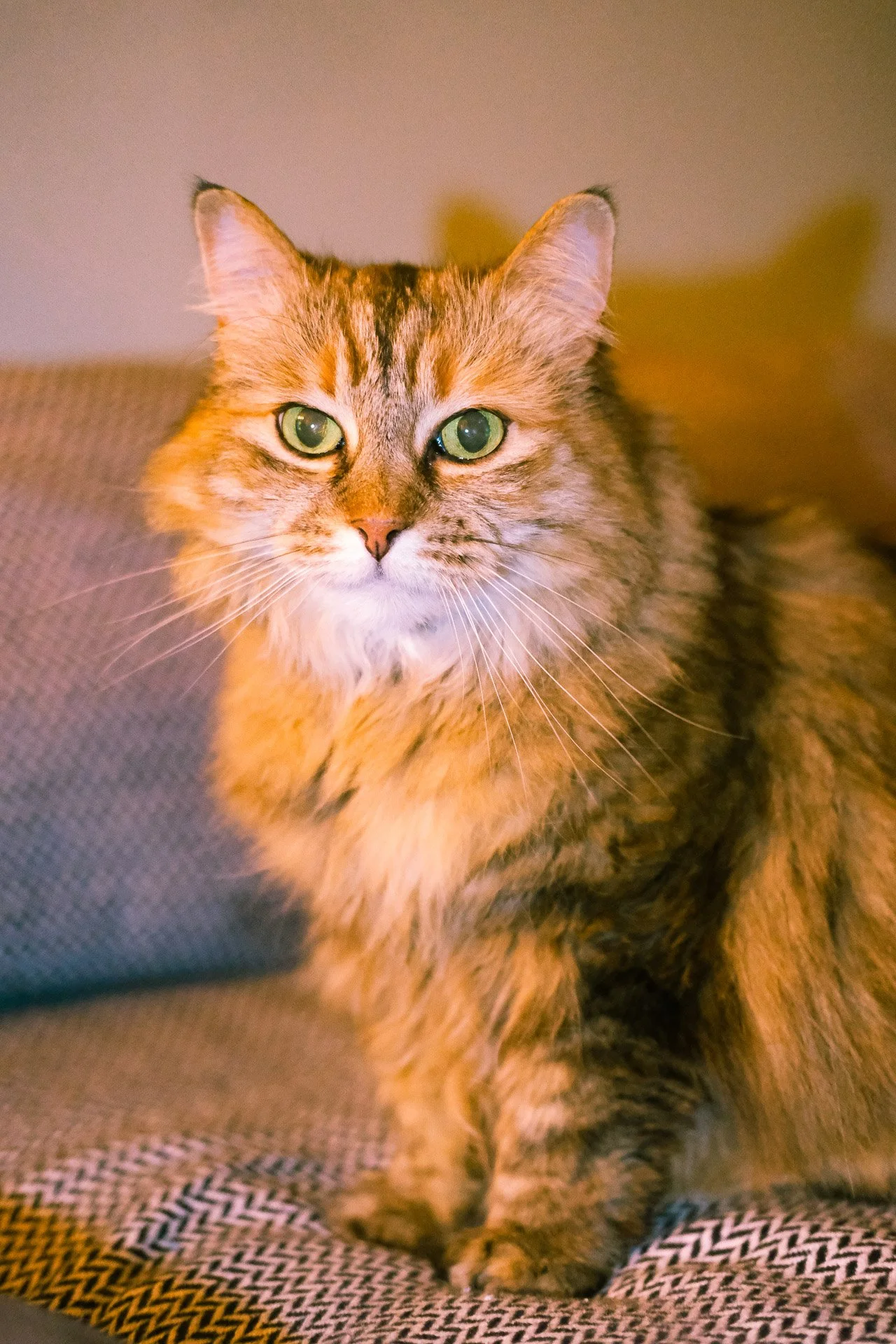 I recommend using a 50mm or 85mm prime lens. These lenses provide ideal compression for cat portraits, create beautiful bokeh, and maintain the perfect distance—neither too close nor too far.