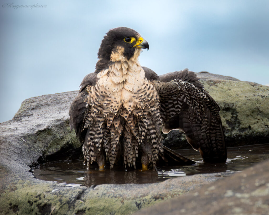 A Peregrine falcon bathing in a small pool of water tucked into a cliff. What makes this even more interesting is that the water likely wasn’t always there. It existed because of an unusually heavy winter, with snow building up and then melting into temporary pockets.