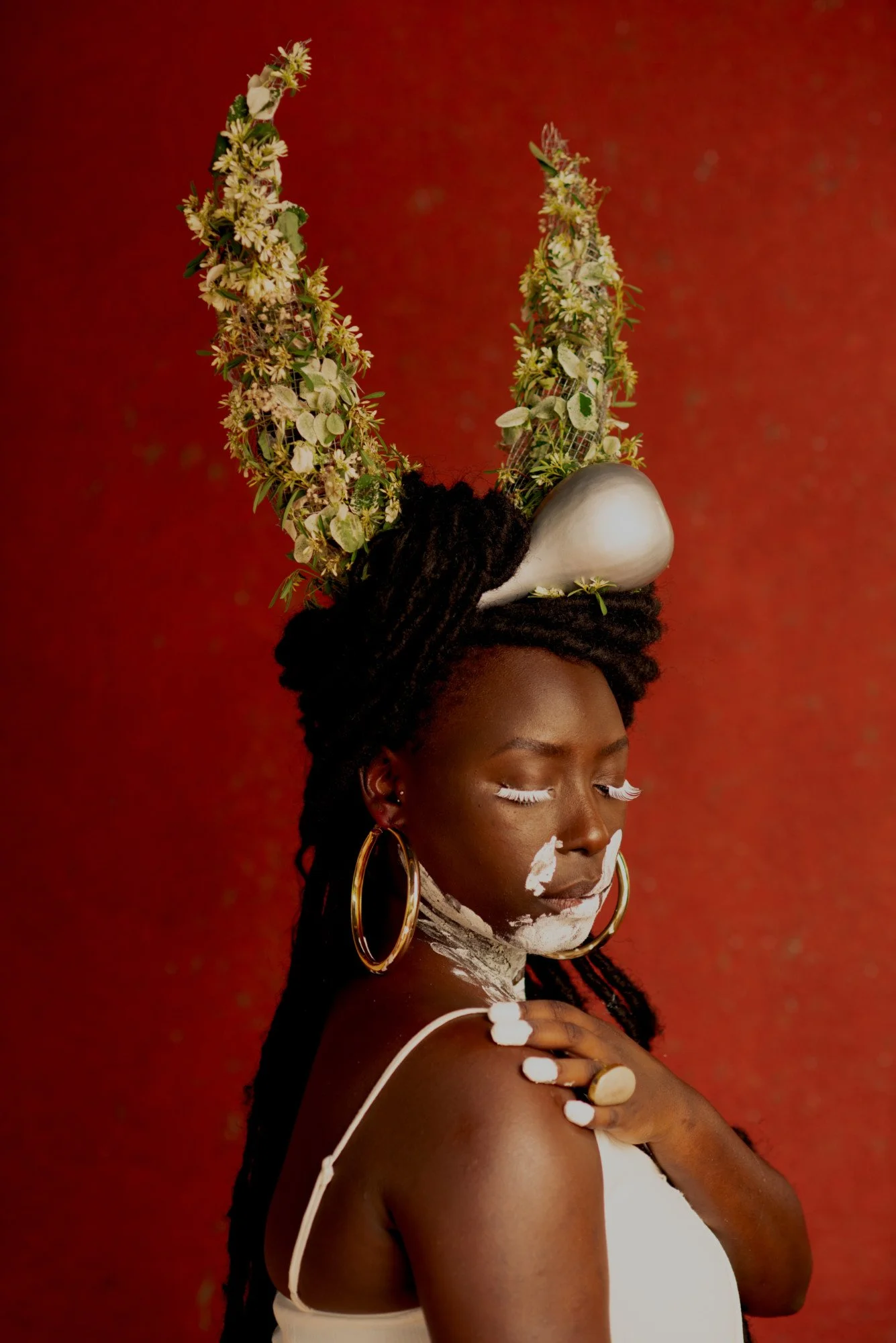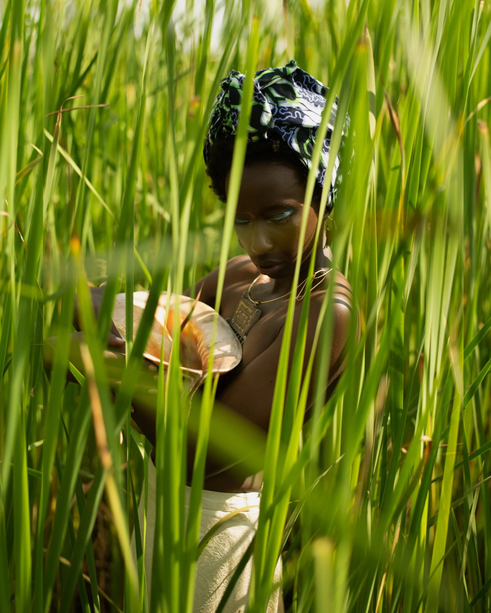We had so much fun looking at references in the Africa Adorned books by Angela Fischer, her creating the flower horns were so perfect and her play with the white paint! So, when she came to me and asked me to photograph her model for the Water Nymph series, there was no hesitation. We both love water and plants, she knows that I love shooting from above, there is a trust that we have in each other that allows the model to shine even if the water cooled.