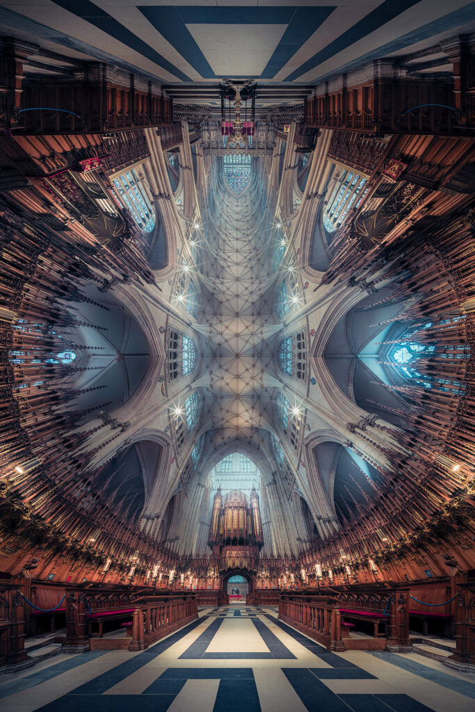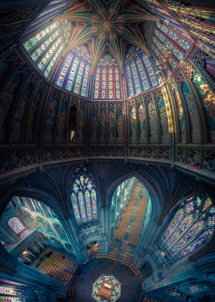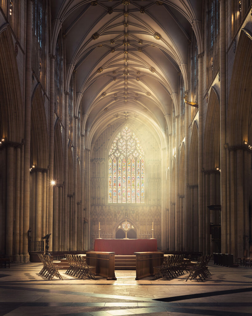 Peter Li: I was contacted by York Minster after they saw some of the vertoramas I’d created for other cathedrals. They were interested in commissioning a new set of images for York Minster, and we had a great conversation about how to approach it. One thing I really wanted was to capture a smoky, hazy atmosphere through the stained glass windows, something I hadn’t been able to do before.